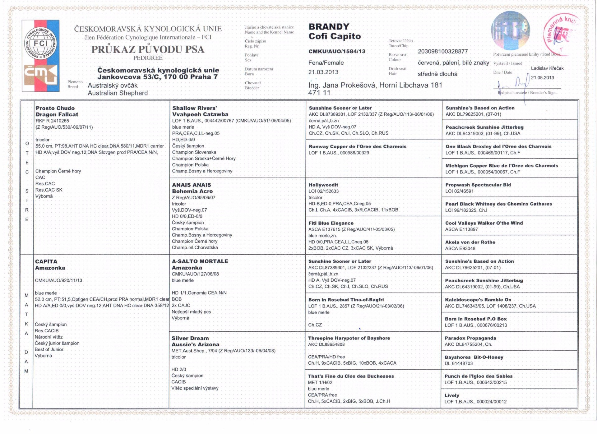 Brandy se narodila v CHS Cofi Capito ing. Jany Prokešové v Horní Libchavě. Ještě před narozením štěňátek jsem si "objednala" fenku red tri s dlouhým ocáskem. A Capinka mi přání splnila. Měla 6 štěňat a z nich jen jedno jediné byla fenka hnědá s krásným bílým límcem a úplně normálním ocáskem. Doma jí říkáme "Arinka" .