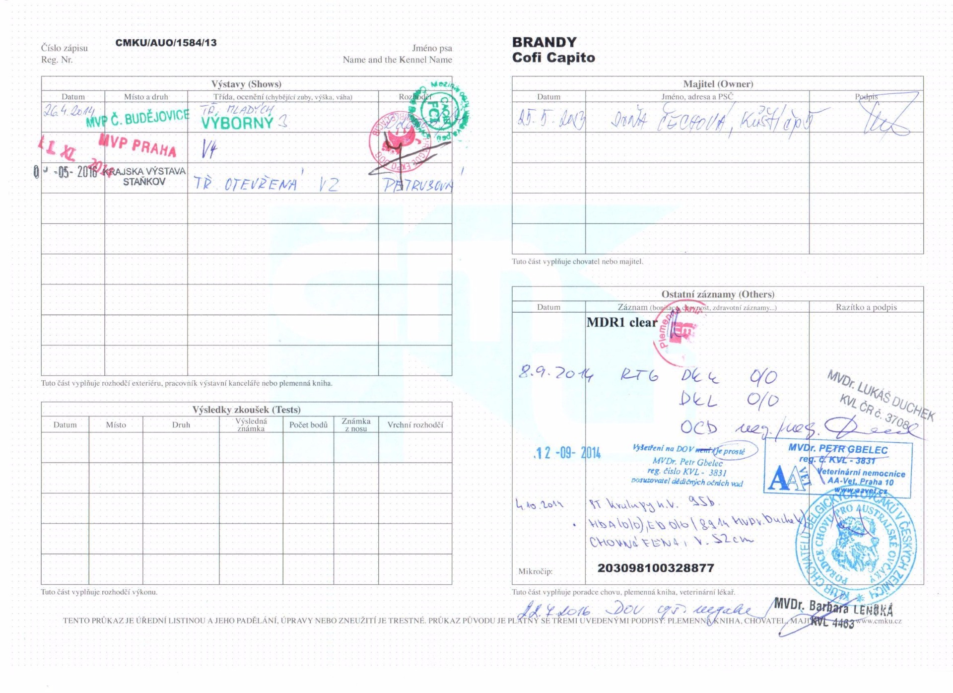 Zdravotní výsledky: RTG DKK 0/0 DKL 0/0 OCD neg/neg DOV prosté MDR 1 N/N (+/+)